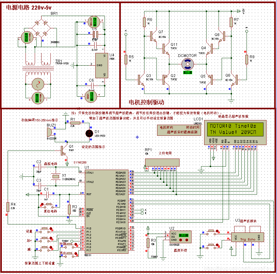 电源电路,H桥电机驱动电路,显示电路,按键电路,报警电路,复位电路,晶振电路,温度采集,超声波电路