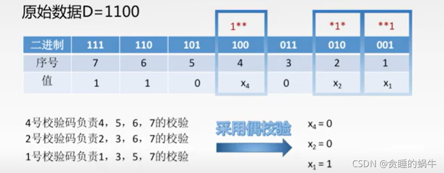 如果采用偶校验,4号校验码负责4,5,6,7 其对应的数为 * ,0,1,1 偶校验需要偶数个1 所以4号位应该是0