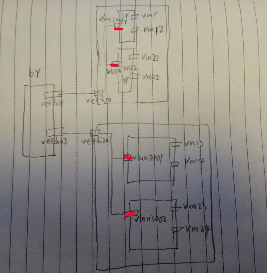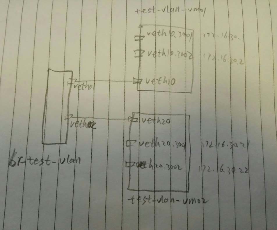 1 #创建网桥 2 brctl addbr br-test-vlan 3 #创建veth对儿 4 ip link add veth01 type veth peer name veth10 5 ip link add veth02 type veth peer name veth20 6 #将veth对儿的一段添加到网桥 7 brctl addif br-test-vlan veth01 8 brctl addif br-test-vlan veth02 9 #启动设备 10 ip link set dev br-test-vlan up 11 ip link set dev veth01 up 12 ip link set dev veth02 up 13 ip link set dev veth10 up 14 ip link set dev veth20 up 15 #创建网络名字空间 16 ip netns add test-vlan-vm01 17 ip netns add test-vlan-vm02 18 #将设备对儿的另一端添加到另个名字空间(其实在一个名字空间也能玩,只是两个名字空间更加形象) 19 ip link set veth10 netns test-vlan-vm01 20 ip link set veth20 netns test-vlan-vm02 21 #分别进入两个名字空间创建vlan和配置ip 22 #配置名字空间test-vlan-vm01 23 ip netns exec test-vlan-vm01 bash 24 #配置vlan 3001 和 vlan 3002 25 vconfig add veth10 3001 26 vconfig add veth10 3002 27 #启动两个vlan的设备 28 ip link set veth10.3001 up 29 ip link set veth10.3002 up 30 #分别在两个vlan上配置ip (这里简单起见,使用了同一个网段了IP,缺点是,需要了解一点儿路由的知识) 31 ip a add 172.16.30.1/24 dev veth10.3001 32 ip a add 172.16.30.2/24 dev veth10.3002 33 #添加路由 34 route add 172.16.30.21 dev veth10.3001 35 route add 172.16.30.22 dev veth10.3002 36 #配置名字空间test-vlan-vm02 37 ip netns exec test-vlan-vm02 bash 38 #配置vlan 3001 和 vlan 3002 39 vconfig add veth20 3001 40 vconfig add veth20 3002 41 #启动两个vlan的设备 42 ip link set veth20.3001 up 43 ip link set veth20.3002 up 44 #分别在两个vlan上配置ip (这里简单起见,使用了同一个网段了IP,缺点是,需要了解一点儿路由的知识) 45 ip a add 172.16.30.21/24 dev veth20.3001 46 ip a add 172.16.30.22/24 dev veth20.3002 47 #添加路由 48 route add 172.16.30.1 dev veth20.3001 49 route add 172.16.30.2 dev veth20.3002