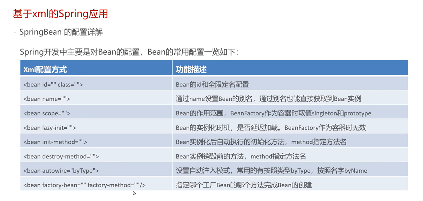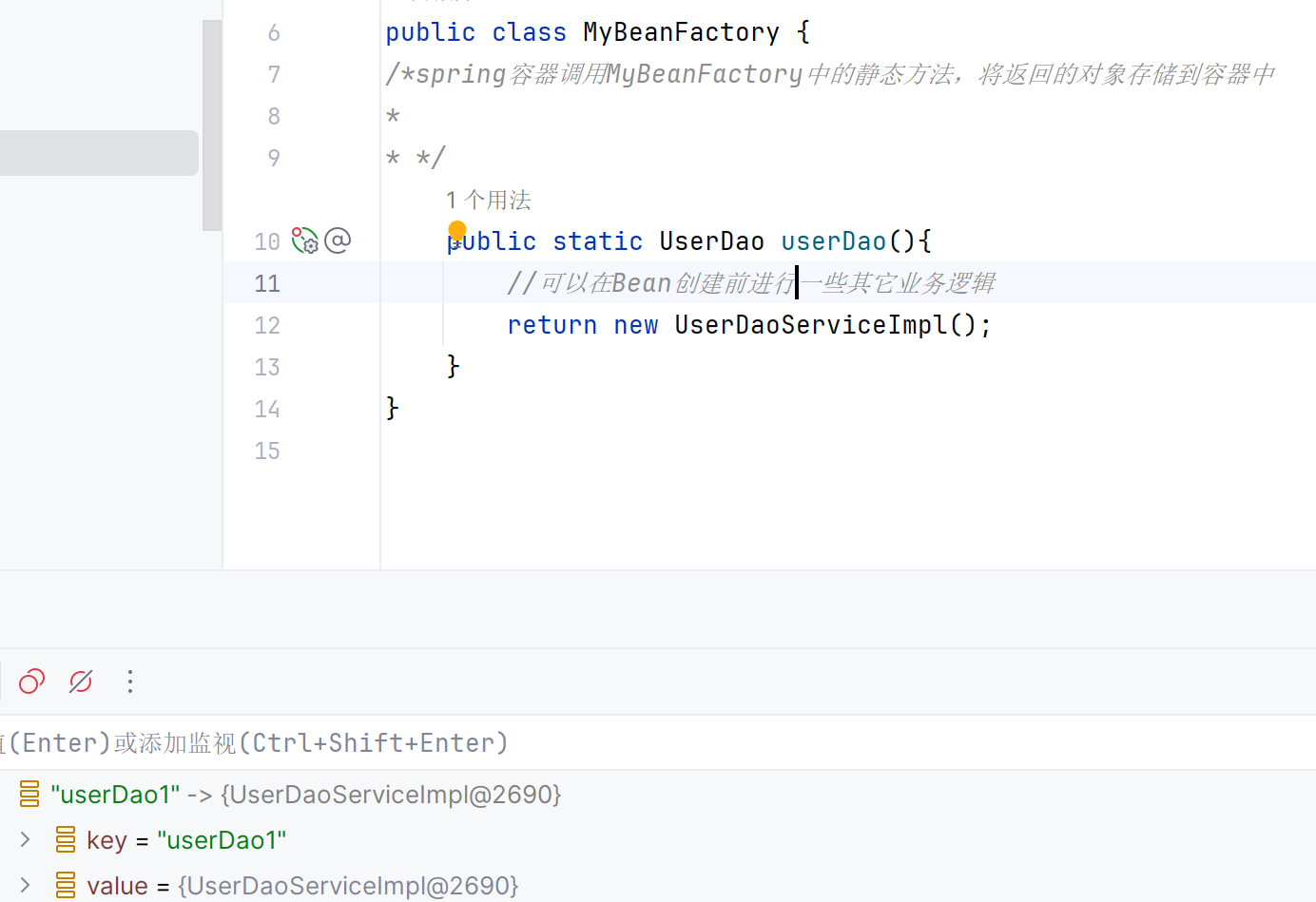 <bean id="userDao1" class="com.example.demo.factory.MyBeanFactory" factory-method="userDao"></bean>