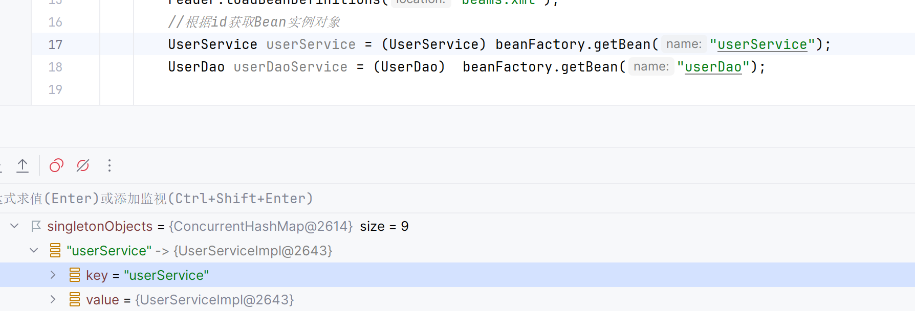 <bean id="userService" class="com.example.demo.service.impl.UserServiceImpl" >中id会对应getbean的name。其实所有的对象都是用 Map集合存储;假设去掉id后,就变成getbean(com.example.demo.service.impl.UserServiceImpl);其中singletonObjects就是单例池。