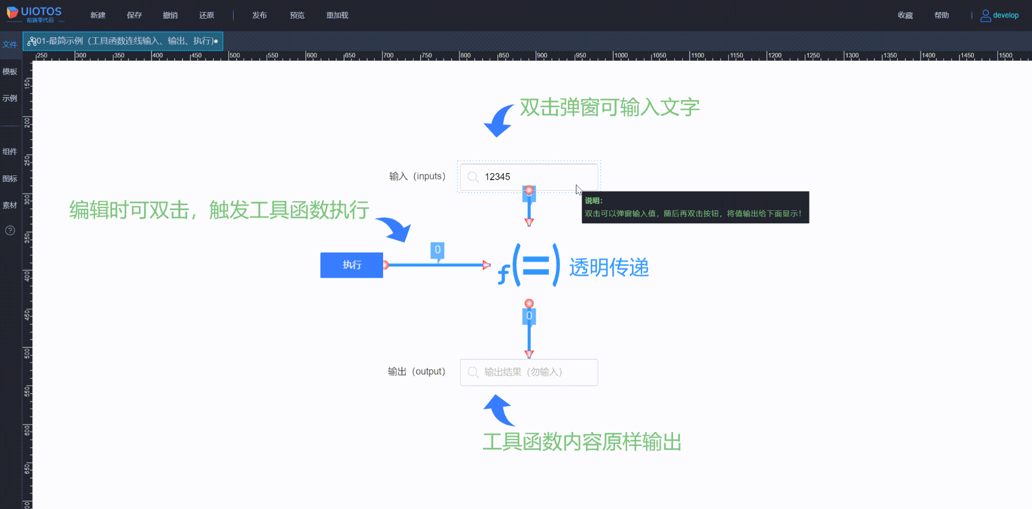 不带任何函数功能,执行时默认将输入直接输出。主要是利用当前组件作为函数和常规组件,都具备的通用功能,比如赋值解析、输出合并、延时执行等特性。