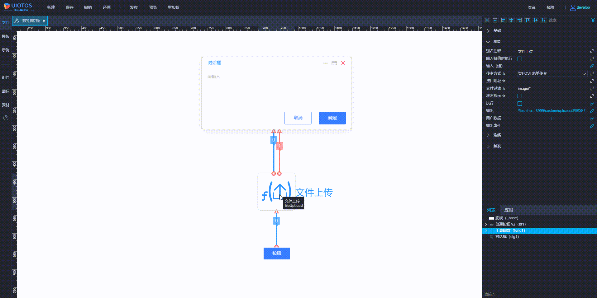 未设置时,使用工具默认的文件上传接口,成功后,将存放的路径URL,通过输出(output)返回。