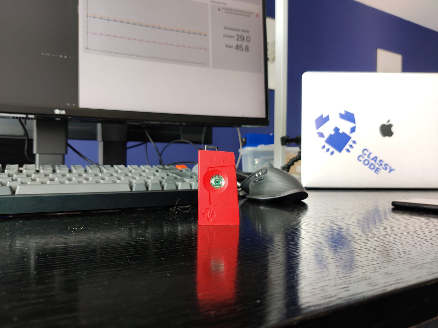 I used a fairly old (~2013) BLE Sensor the CC2541 Sensor Tag from Texas Instruments. Featuring an Accelerometer and Gyroscope, Humidity, Temperature and Pressure Sensors as well as a Magnetometer. I’ll use the accelerometer as well as the temperature sensor. The accelerometer can easily provide interesting live data. However, the temperature sensor is rather static, so I’ll only capture data “on-demand” with a click on the sensor’s left button.