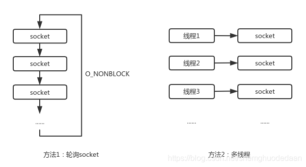 多路复用是怎么一回事呢?我们假设一下有100个socket,在某一时间可能只有个别socket是有数据的,即客户端向服务端发送的请求数据。此时服务程序怎么监控这100个socket,找出有数据的socket,并做出响应?有一种做法,就是非阻塞读每个socket,没数据直接返回读下一个,有数据(请求)就响应,以此实现轮询。还有一种做法,创建100个进程/线程,每个线程,进程对应一个socket。