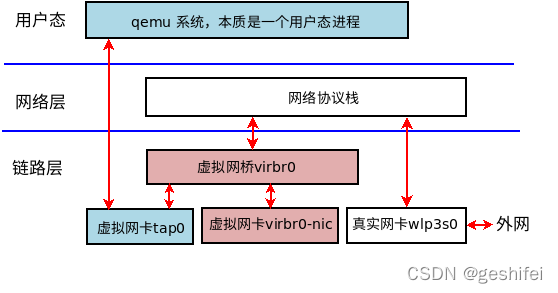 qemu中的网络数据包<--->tap设备<--->virbr0网桥<--->网络协议栈<--->ubuntu中的真实网卡,从而实现qemu访问外网功能。