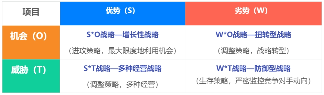 4.SO对策:着重考虑优势因素和机会因素,目的在于努力使这两种因素都趋于最大。