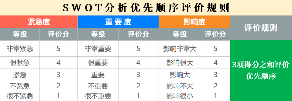 1.SWOT优先顺序评价规则:在开展矩阵分析时,按照紧急度、重要度、影响度三个方面,按照以下标准进行评价,排出优先顺序。