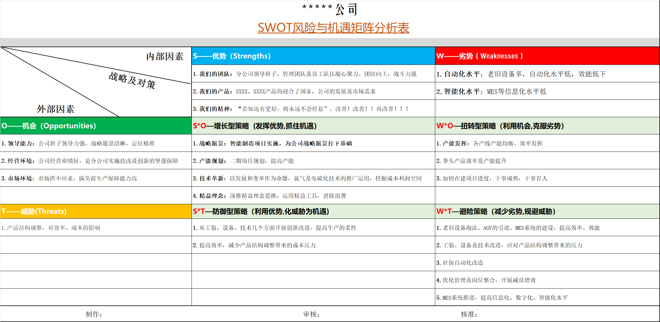 2.威胁和劣势的原因和对策:结合公司具体情况,对威胁与劣势进行充分的评估和判断,客观评价,将威胁降到最低,将劣势减到最小。