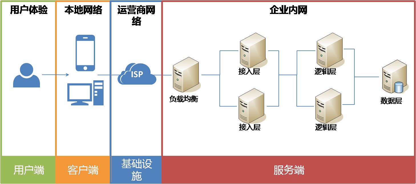 常见的互联网业务多为分布式的高可用架构,典型架构如下图,分价构成管理,用户通过运营商与客户端访问到企业的内网,获取互联网产品的功能和服务。