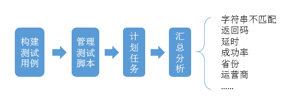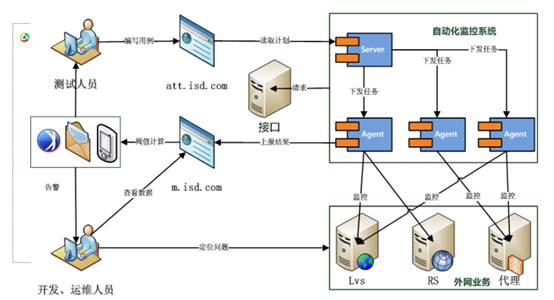 WEB监控方法中,还有一种常用的手段,是利用外部探测点对WEB服务波测,以此来获取服务的质量数据的监控能力,在腾讯我们称之为自动化测试服务。这是一种被动监控的手段,无需业务开发配合修改代码,直接通过黑盒模拟用户访问我们WEB服务或cgi的传参,构造出与真实业务请求一样的url对WEB服务质量进行的波测。如下图所示,这种监控手段需要有测试人员(或其他技术人员),提前编写好测试用例,并需要部署在不同分布点来模拟不同地域的用户请求,然后便可以通过定时任务调度来对WEB服务质量进行波测。
