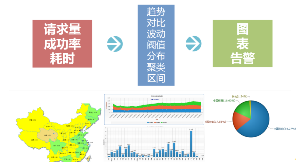 上面介绍了几种典型的互联网监控方式,概括下监控的本质,无非就是把服务质量从请求量、成功率、耗时这三个纬度,通过不同的分析策略,最终产出图、表和告警。