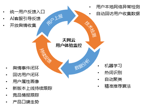 负责跟进这类问题的运维同事发现,这些反馈和投诉都是非上述监控手段能够发现的,因为所有的投诉来源都不是格式化的数据,不是请求量、成功率、耗时这类常见的指标,而是从用户的言论中分析得到的。为了打造立体化的监控体系,我们建设了天网云-用户体验监控系统,专门针对用户言论的监控,旨在从中能够及时监控到与服务质量相关的关键信息。