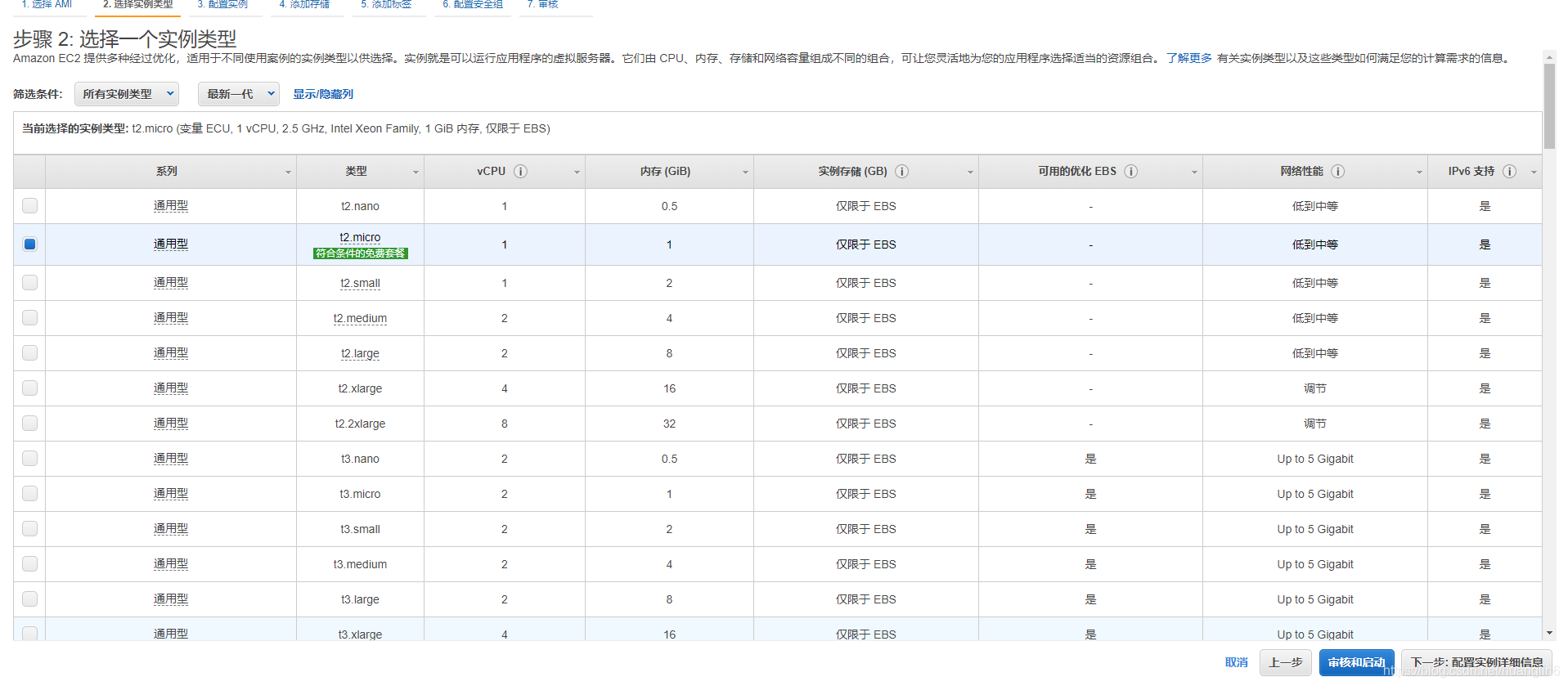 5、选择实例类型t2.micro,然后后面一直默认,直到选择审核和启动。