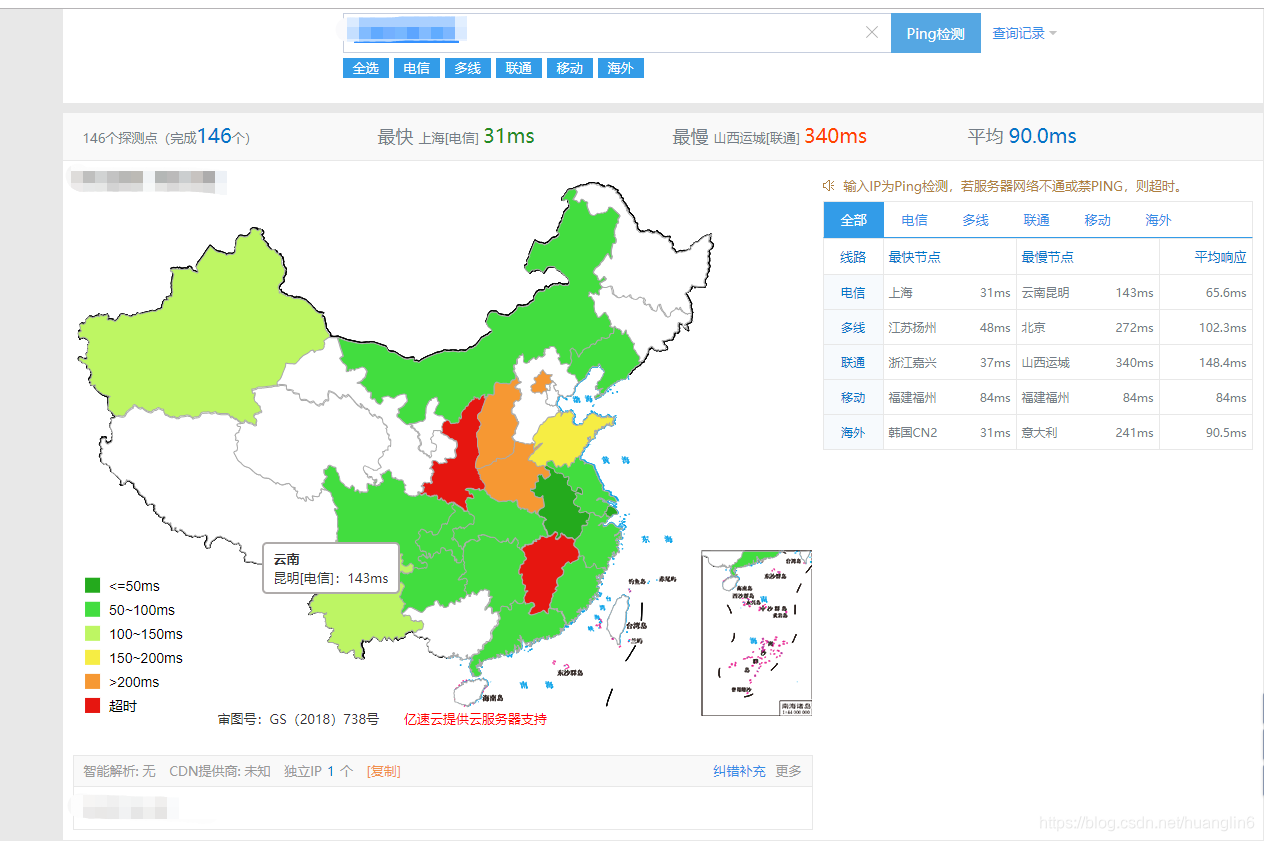 用站长工具检测一下,网址:http://ping.chinaz.com/