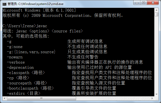 (2)进入到 jdk安装路径\bin目录下,执行javac,会看到javac参数提示信息。