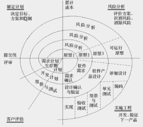 螺旋模型,尤其重视风险分析阶段,特别适用于庞大并且复杂,非常高风险的项目。通常螺旋模型由四个阶段组成:制定计划、风险分析、实施工程和客户评估。螺旋模型中,发布的第一个模型甚至可能是没有任何产出的,可能仅仅是纸上谈兵的一个目标,但是随着一次次的交付,每一个版本都会朝着固定的目标迈进,最终得到一个更加完善的版本。