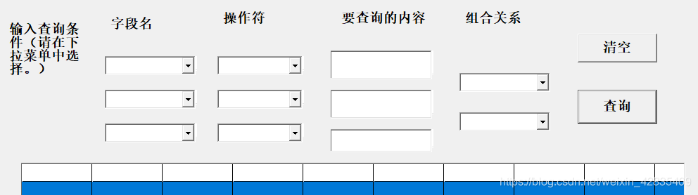 - 选择字段名、操作符、要查询的内容、组合关系,点击查询按钮: