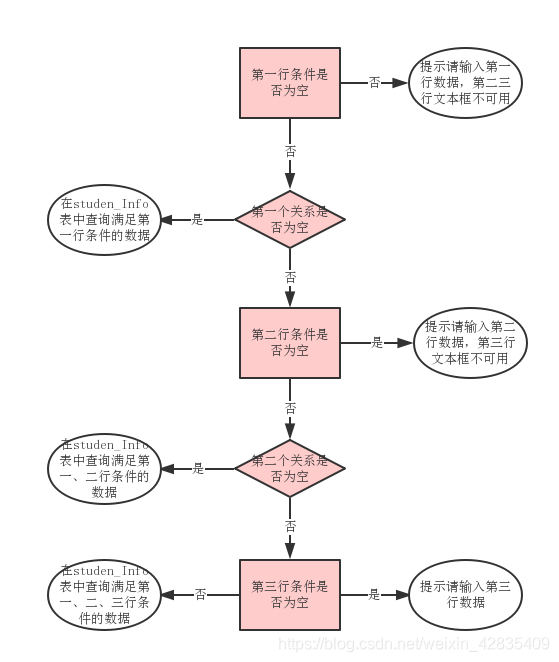 - 若第二行条件不为空:若第二个关系为空,则查询第一二行条件中数据;若第二个关系不为空,则判断第三行条件是否为空;