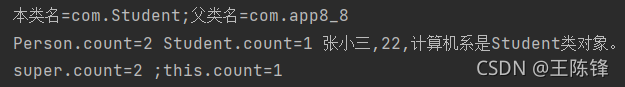 public class app8_8 {//定义app8_8类 static int count = 0;//定义静态变量count protected String name; protected int age; public app8_8(String n1, int a1)//构造方法 { name = n1; age = a1; this.count++;//调用父类的静态变量 } public String toString() { return this.name + "," + this.age; } public void display() { System.out.print("本类名=" + this.getClass().getName() + ";"); System.out.println("父类名=" + this.getClass().getSuperclass().getName()); System.out.print("Person.count=" + this.count + " "); System.out.print("Student.count=" + Student.count + " "); Object obj = this; if (obj instanceof Student)//判断对象属于哪个类 System.out.println(obj.toString() + "是Student类对象。"); else if (obj instanceof app8_8) System.out.println(obj.toString() + "是Person类对象."); } } class Student extends app8_8//子类Student继承自父类app8_8,且是主类但不是public类 { static int count=0;//隐藏了父类的count protected String dept; protected Student(String n1,int a1,String d1) { super(n1,a1);//调用父类的构造方法 dept=d1; this.count++;//调用子类的静态变量 } public String toString()//覆盖父类的同名方法 { return super.toString()+","+dept;//调用父类的同名方法 } public void display() { super.display();;//调用父类的方法 System.out.print("super.count="+super.count);//引用父类的变量 System.out.println(" ;this.count="+this.count); } public static void main(String[] args) { app8_8 per=new app8_8("王小桃",23); per.display(); Student stu=new Student("张小三",22,"计算机系"); stu.display(); } }