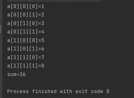 public class sentence { public static void main(String[] args) { int i,j,k,sum=0; int [][][] a={{{1,2},{3,4}},{{5,6},{7,8}}};//一维2个数,二维2个数,三维2个数 for(i=0;i<a.length;i++) for(j=0;j<a[i].length;j++) for(k=0;k<a[i][j].length;k++) { System.out.println("a["+i+"]["+j+"]["+k+"]="+a[i][j][k]); sum+=a[i][j][k]; } System.out.println("sum="+sum); } }