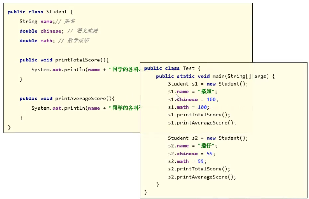 但是实际上姓名、语文成绩、数学成绩三个数据可以放在一起,组合成一个对象,然后让对象提供方法对自己的数据进行处理。这种方式称之为面向对象编程。