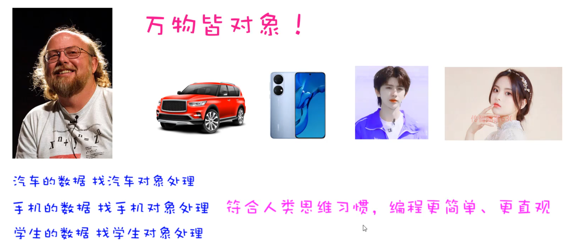 Java的祖师爷,詹姆斯高斯林认为,在这个世界中 **万物皆对象!**任何一个对象都可以包含一些数据,数据属于哪个对象,就由哪个对象来处理。