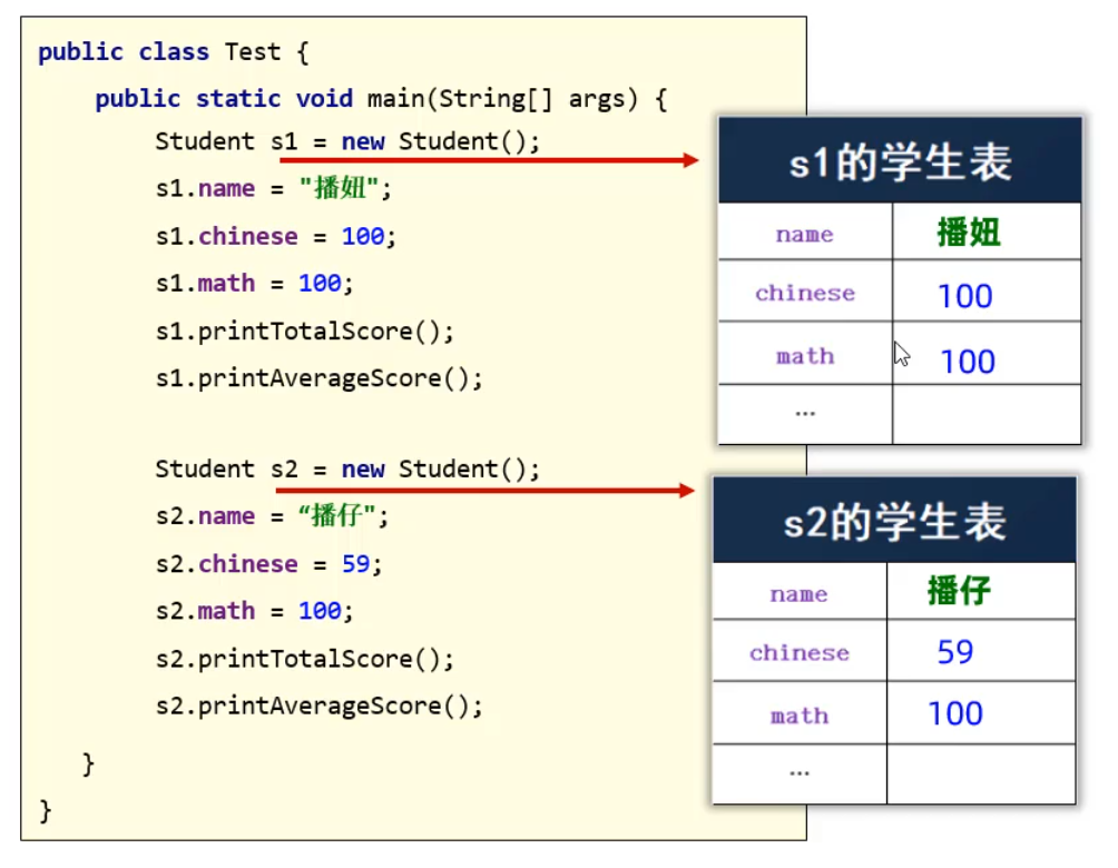 s1.name=“播妞”时,其实就是通过s1找到对象的地址,再通过对象找到对象的name属性,再给对象的name属性赋值为播妞;