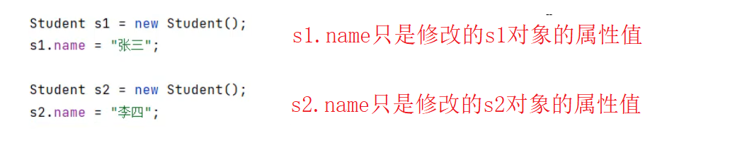 如下图所示,s1和s2两个变量分别记录的是两个对象的地址值,各自修改各自属性值,是互不影响的。