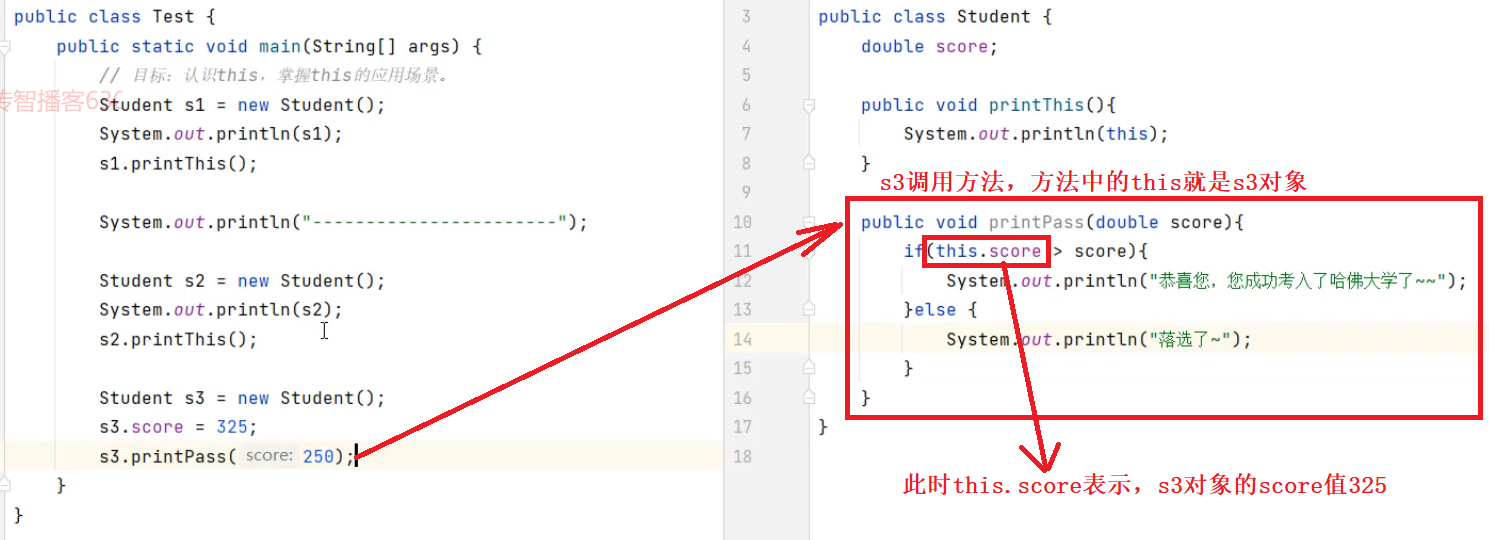 分析上面的代码s3.score=325,调用方法printPass方法时,方法中的this.score也是325; 而方法中的参数score接收的是250。执行结果是