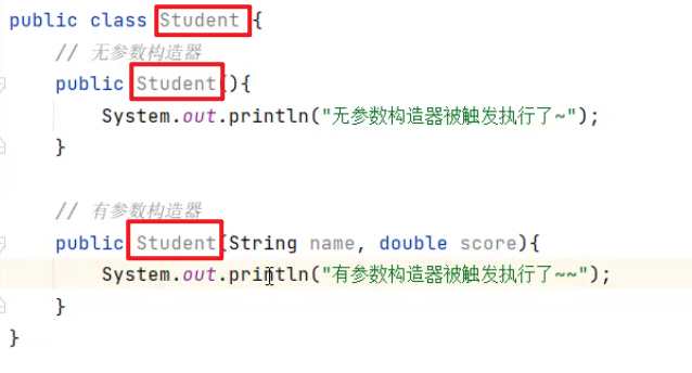 - 什么是构造器?构造器其实是一种特殊的方法,但是这个方法没有返回值类型,方法名必须和类名相同。如下图所示:下面有一个Student类,构造器名称也必须叫Student;也有空参数构造器,也可以有有参数构造器。