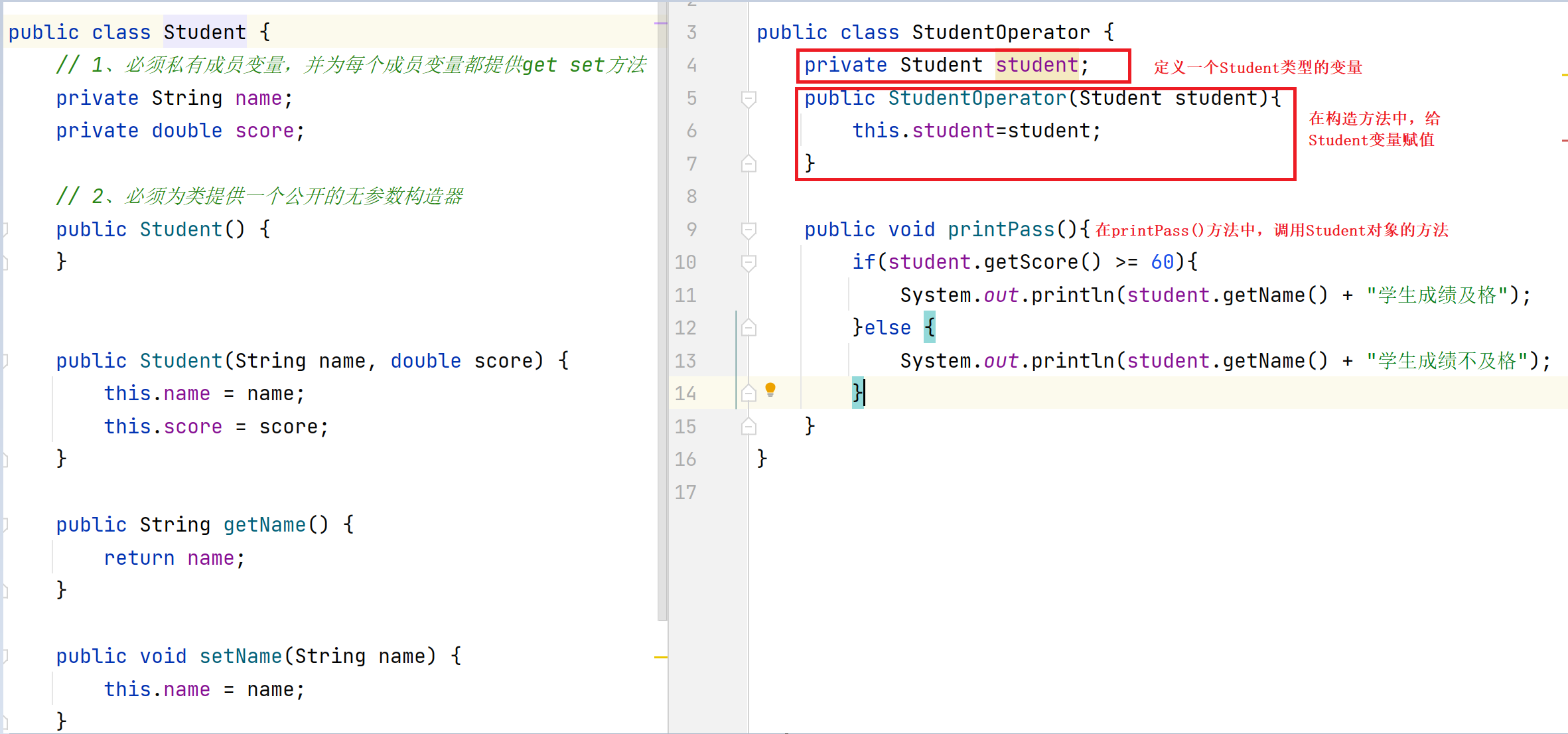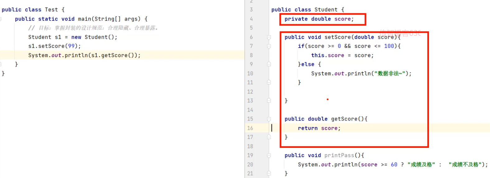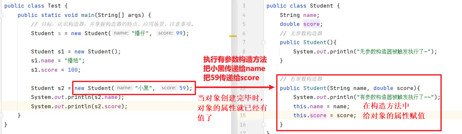 当执行new Student("播仔",99)创建对象时,就是在执行有参数构造器,当有参数构造器执行完,就意味着对象创建完毕了。![]()