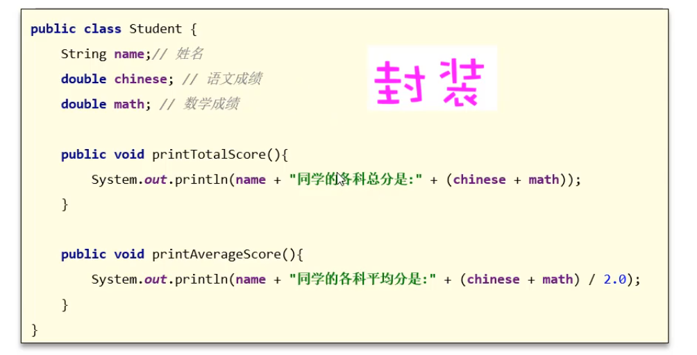 比如:在设计学生类时,把学生对象的姓名、语文成绩、数学成绩三个属性,以及求学生总分、平均分的方法,都封装到学生对象中来。
