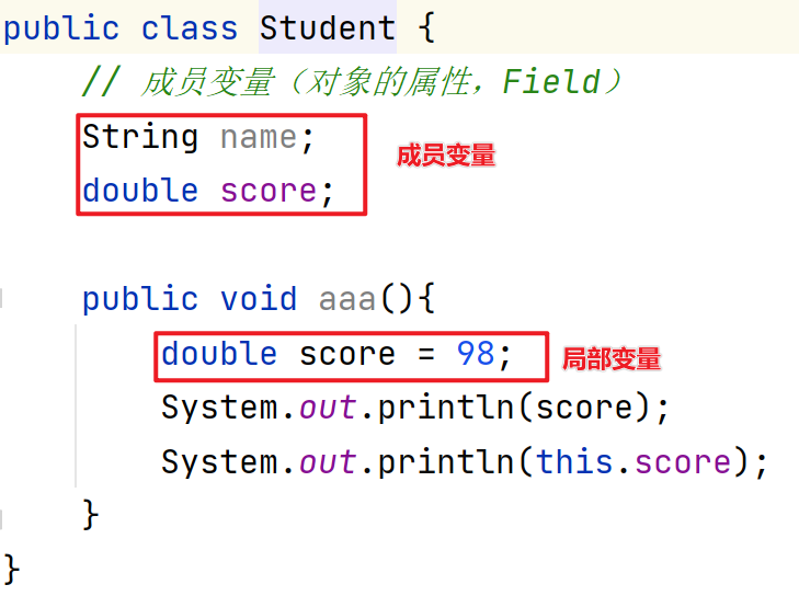 如下图所示,成员变量在类中方法外,而局部变量在方法中。