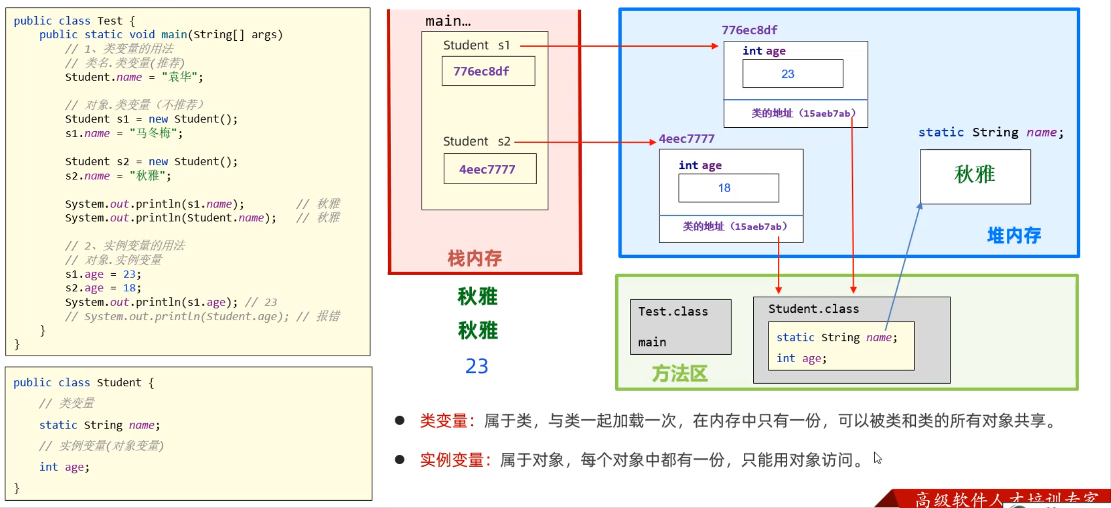 - 下面是代码演示(注意静态变量,和实例变量是如何调用的)