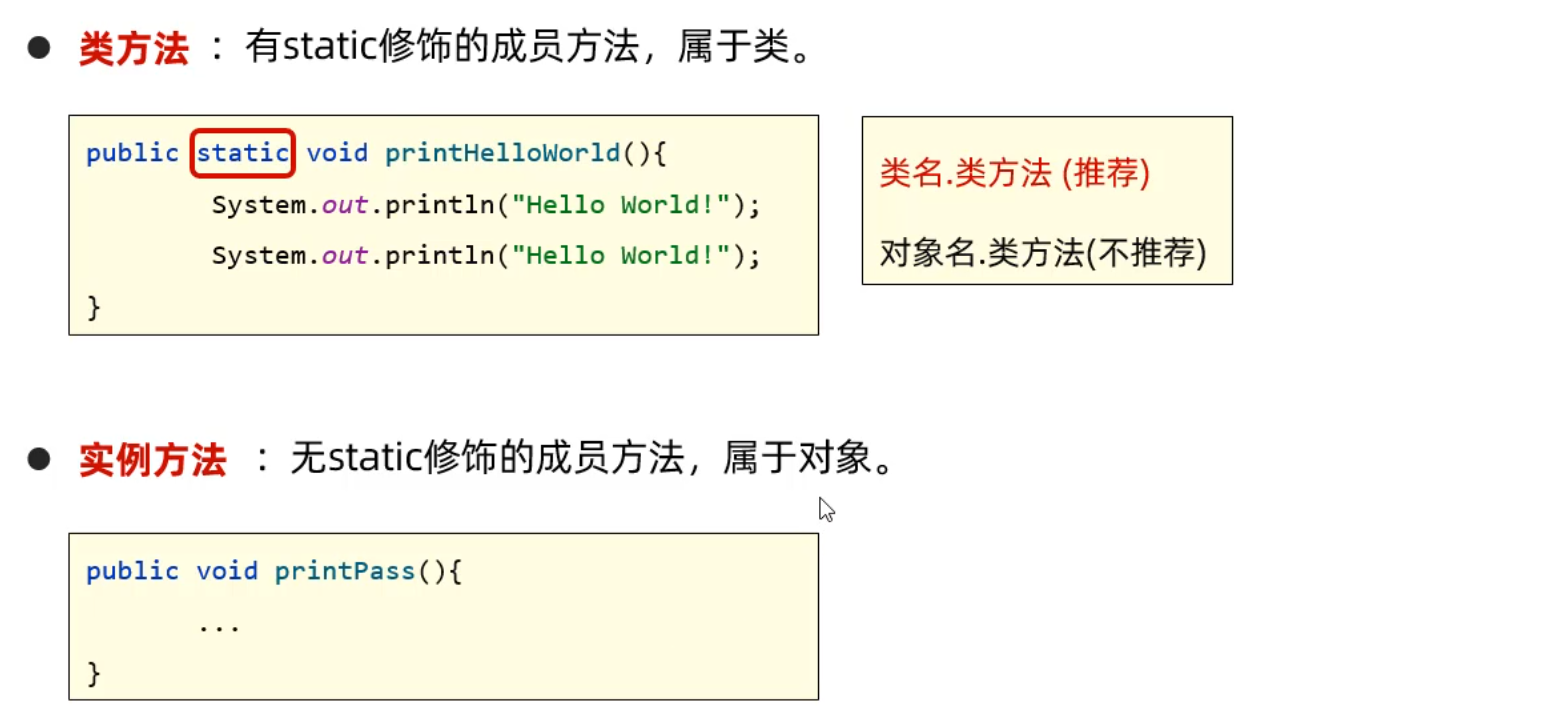 各位同学,学习完static修饰成员变量之后,接下来我们学习static修饰成员方法。成员方法根据有无static也分为两类:类方法、实例方法