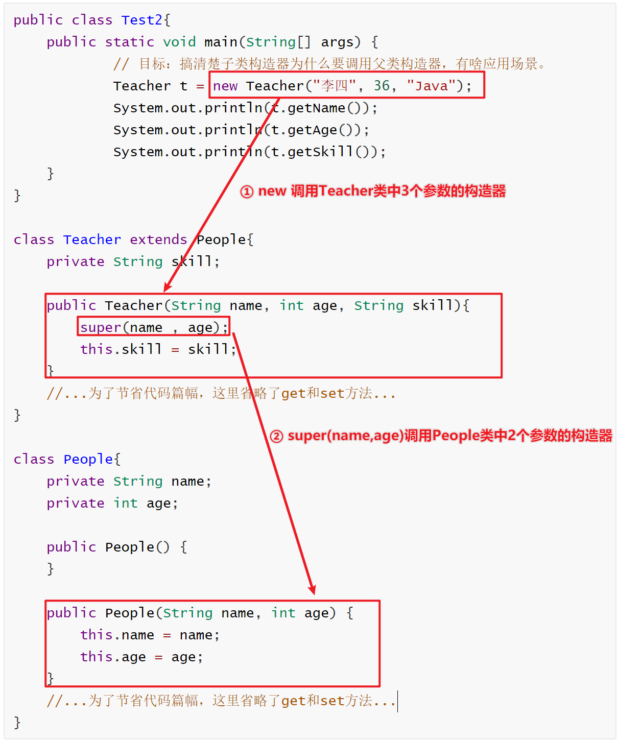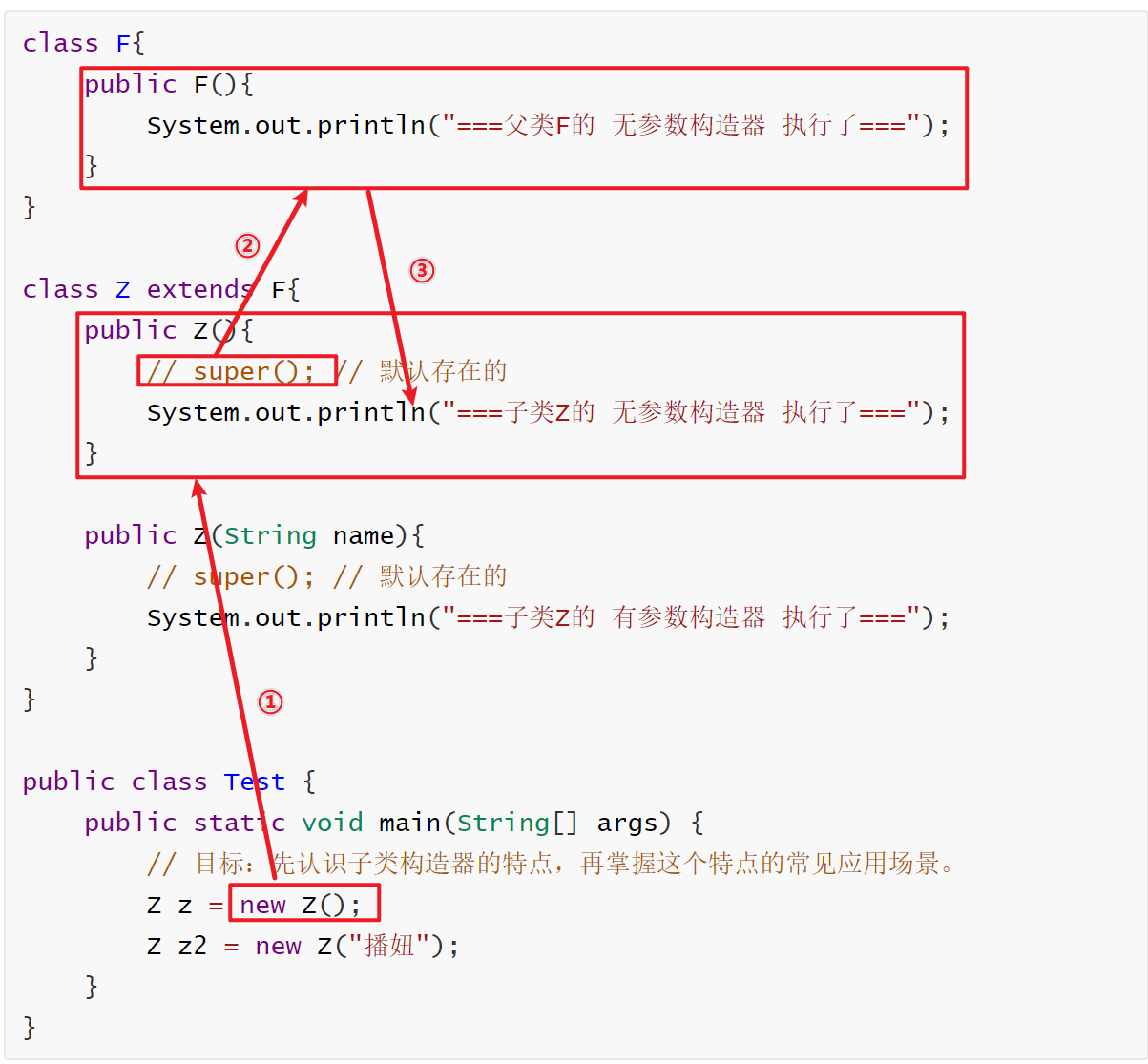 - 首先,子类全部构造器,都会先调用父类构造器,再执行自己。执行顺序,如下图按照① ② ③ 步骤执行: