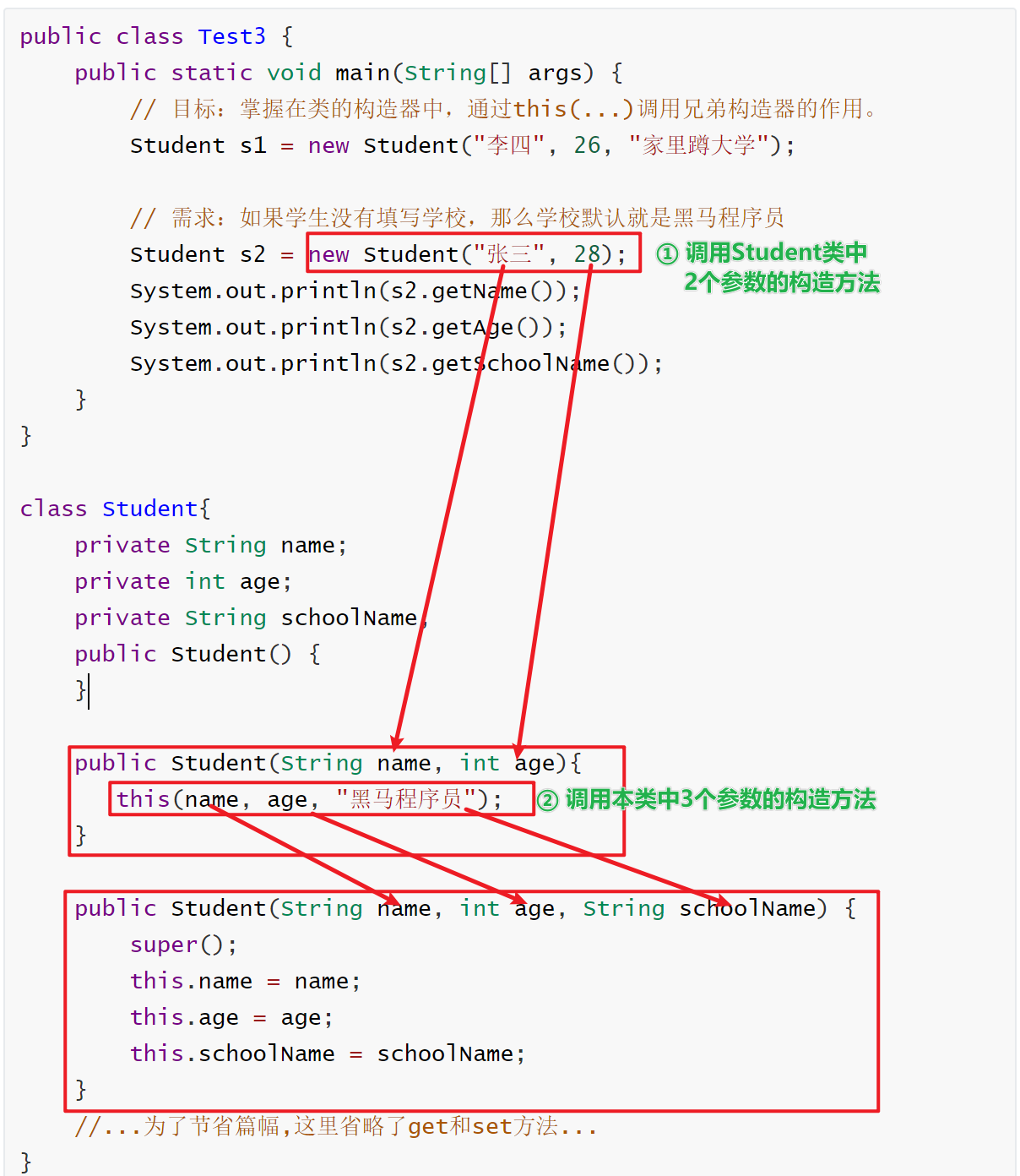 刚才我们学习了通过super()和super(参数)可以访问父类的构造器。有时候我们也需要访问自己类的构造器。语法如下