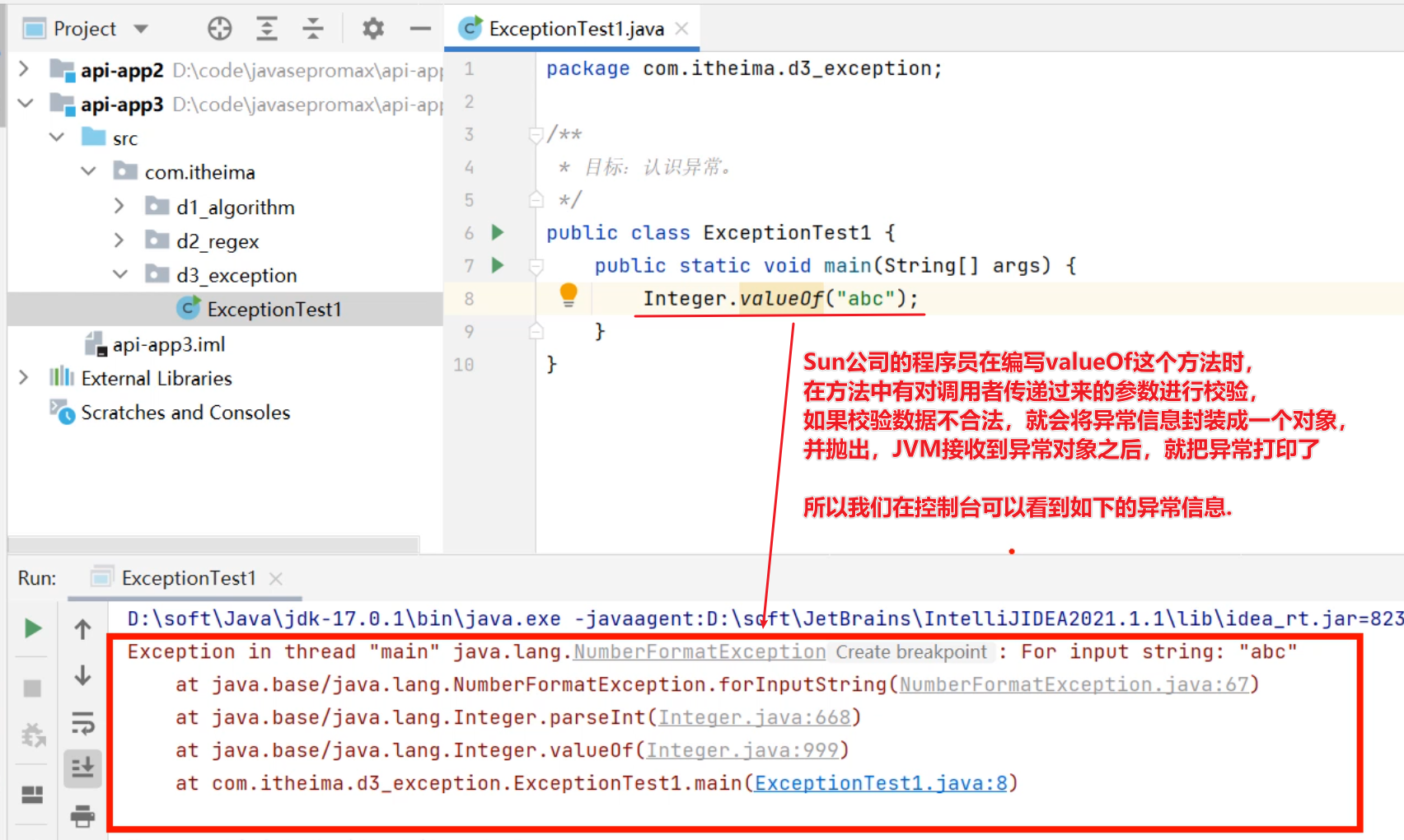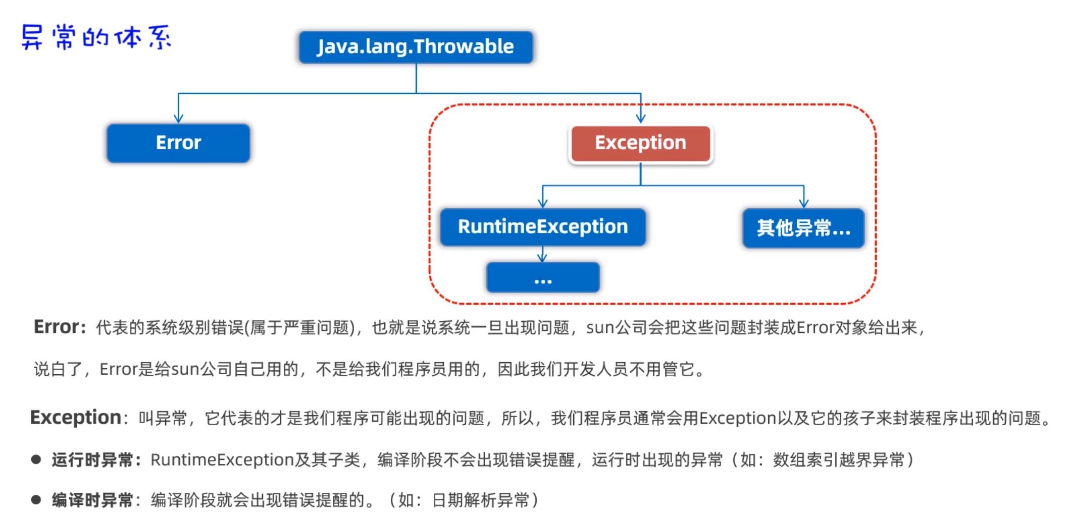 那肯定有同学就纳闷了,我写代码天天出异常,我知道这是异常啊!我们这里学习异常,其实是为了告诉你异常是怎么产生的?只有你知道异常是如何产生的,才能避免出现异常。以及产生异常之后如何处理。