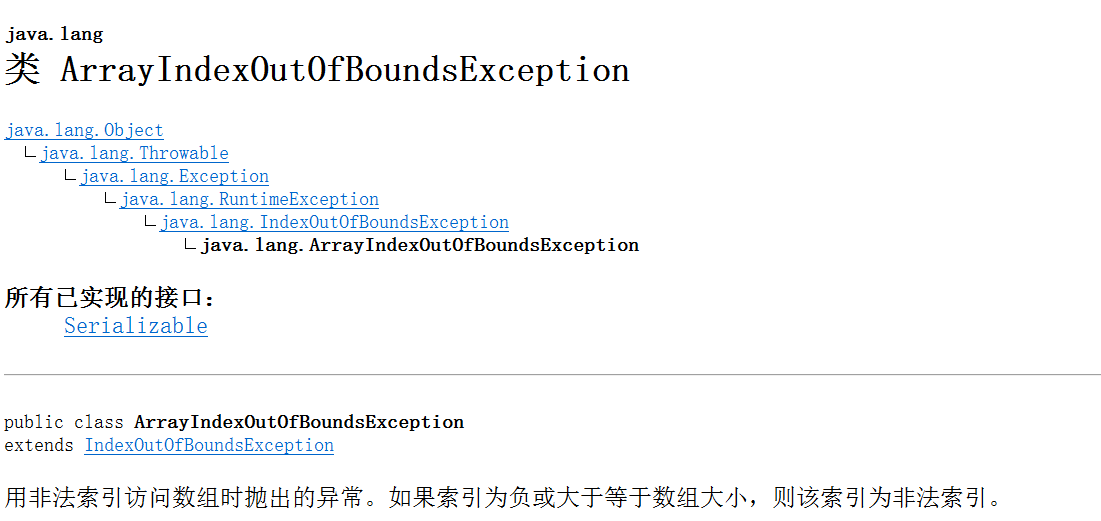 下图是API中对ArrayIndexOutOfBoundsExcpetion类的继承体系,以及告诉我们它在什么情况下产生。