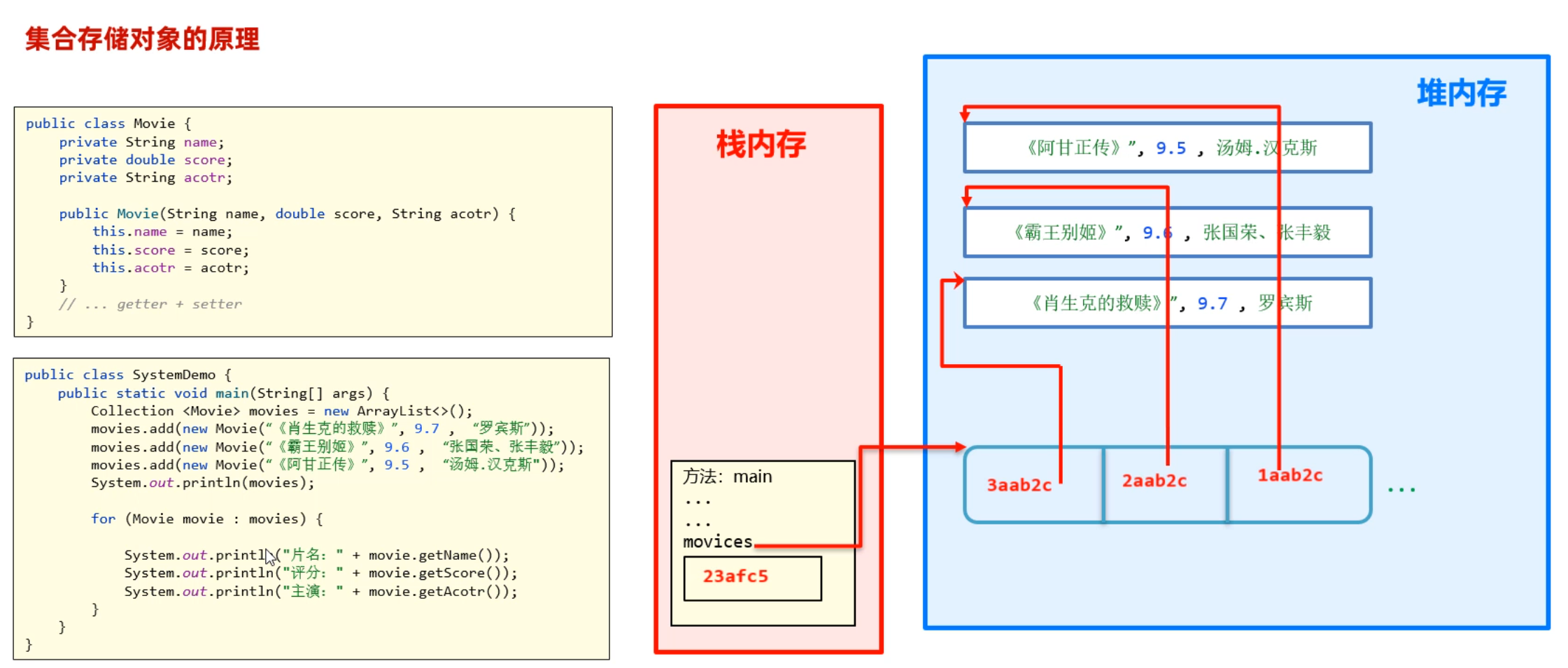 以上代码的内存原理如下图所示:当往集合中存对象时,实际上存储的是对象的地址值