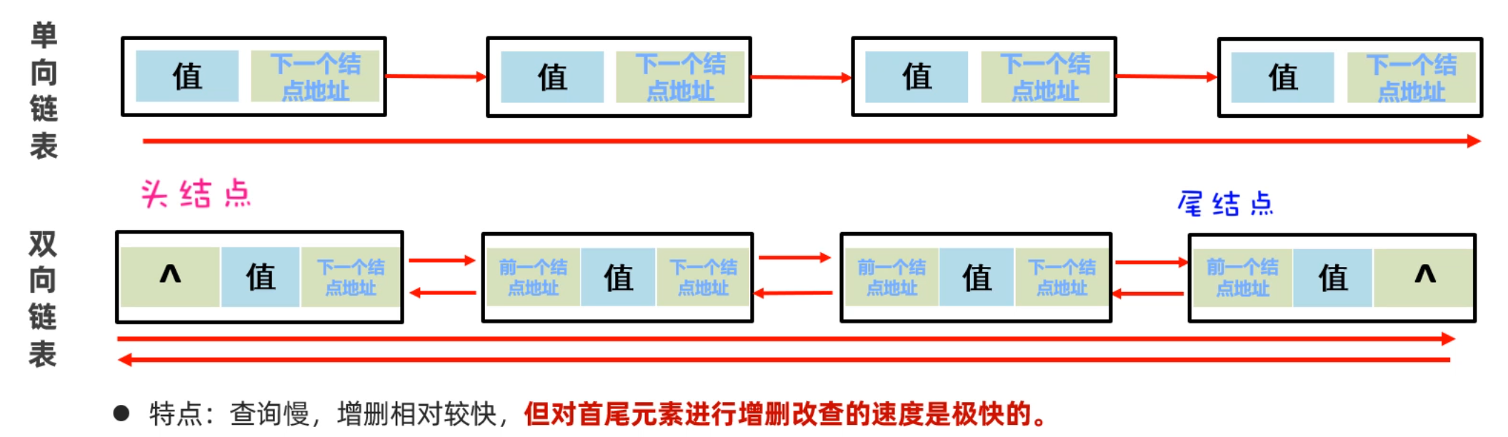 上面的链表是单向链表,它的方向是从头节点指向尾节点的,只能从左往右查找元素,这样查询效率比较慢;还有一种链表叫做双向链表,不光可以从做往右找,还可以从右往左找。如下图所示: