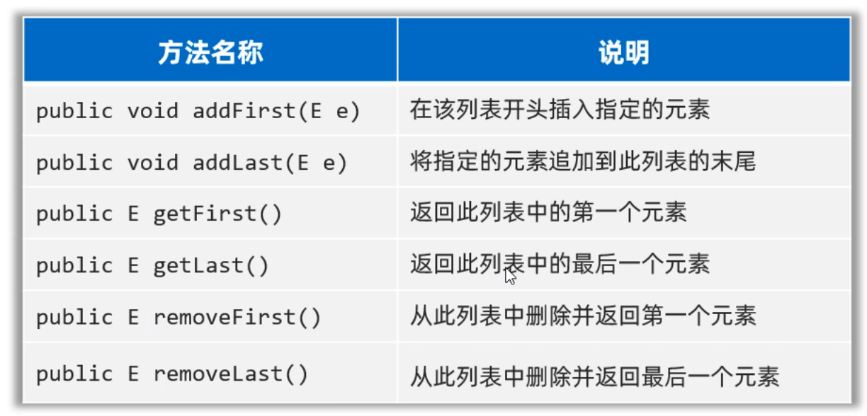 LinkedList集合是基于双向链表实现了,所以相对于ArrayList新增了一些可以针对头尾进行操作的方法,如下图示所示: