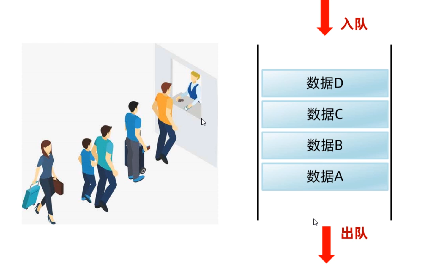 - 我们先来认识一下队列结构,队列结构你可以认为是一个上端开口,下端也开口的管子的形状。元素从上端入队列,从下端出队列。