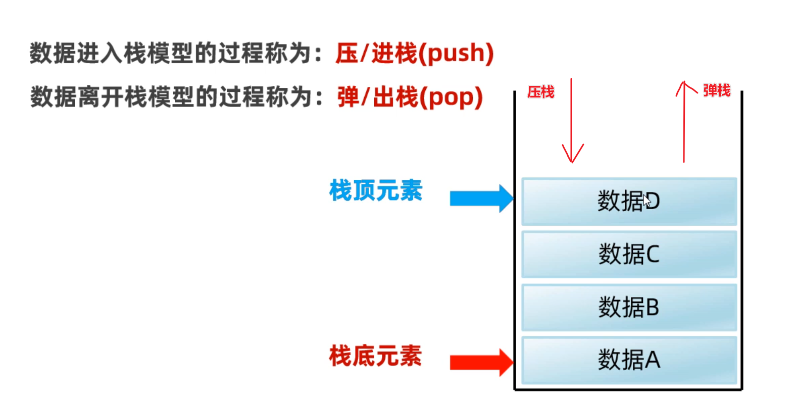 - 接下来,我们再用LinkedList集合来模拟一下栈结构的效果。还是先来认识一下栈结构长什么样。栈结构可以看做是一个上端开头,下端闭口的水杯的形状。元素永远是上端进,也从上端出,先进入的元素会压在最底下,所以栈结构的特点是先进后出,后进先出