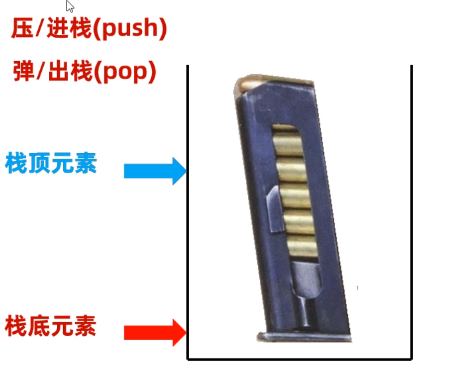 有没有感觉栈结构很像,手枪的子弹夹呀!!第一个压进入的子弹在最底下,最后一个才能打出来,最后一个压进入的子弹在最顶上,第一个打出来。