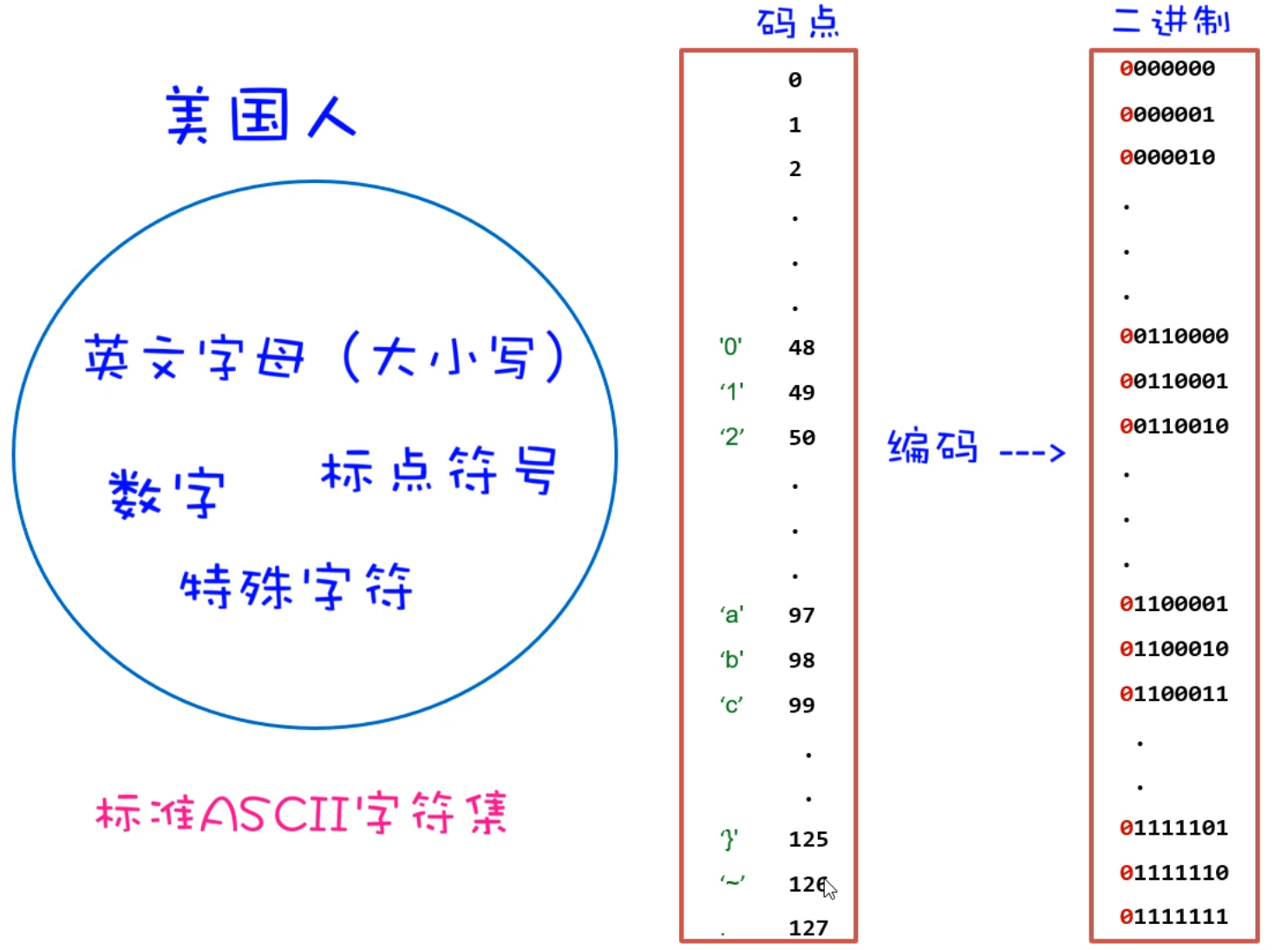 我们知道计算机是美国人发明的,由于计算机能够处理的数据只能是0和1组成的二进制数据,为了让计算机能够处理字符,于是美国人就把他们会用到的每一个字符进行了编码(所谓编码,就是为一个字符编一个二进制数据),如下图所示: