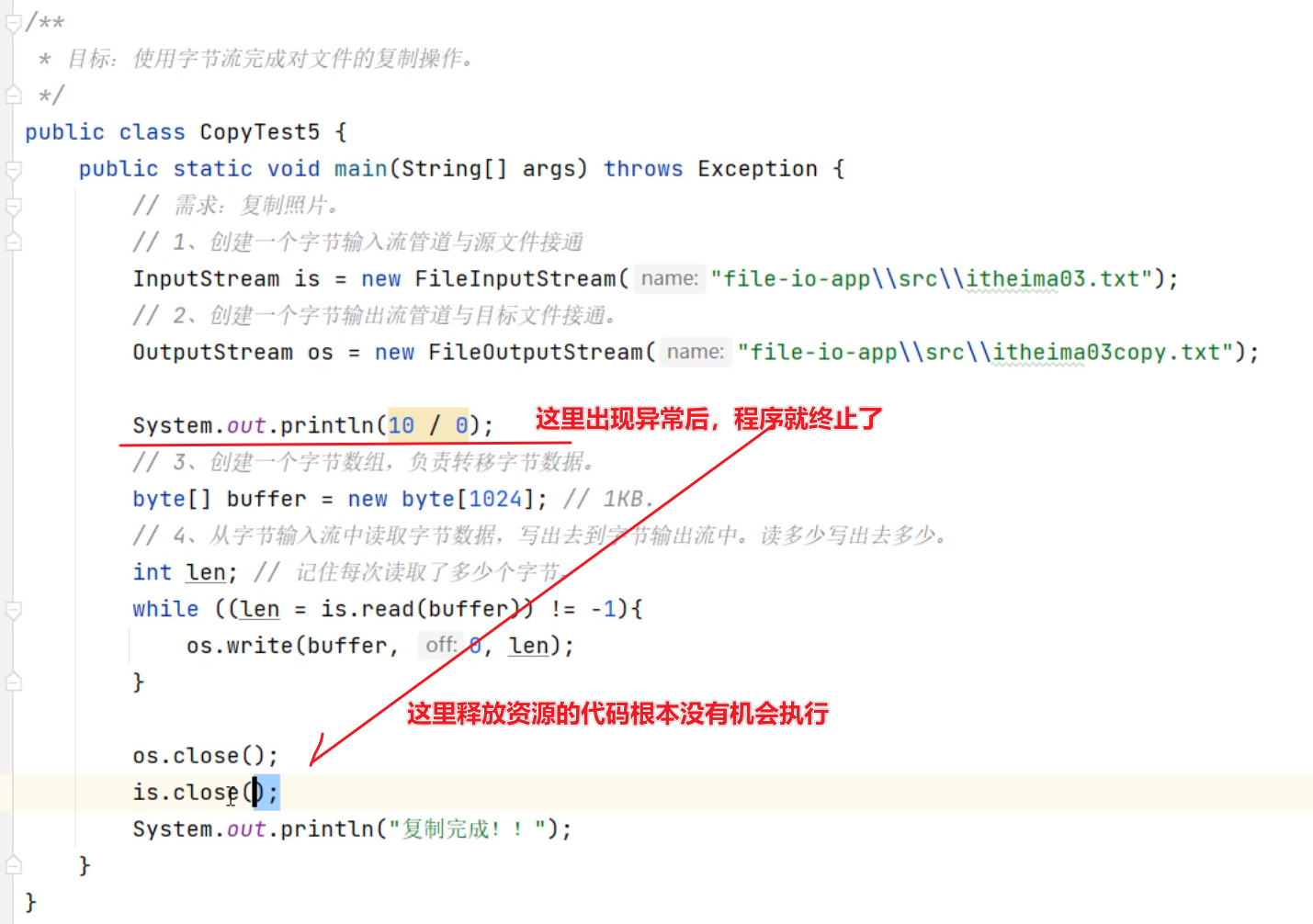 各位同学,前面我们已经学习了字节流,也给同学们强调过,流使用完之后一定要释放资源。但是我们之前的代码并不是很专业。