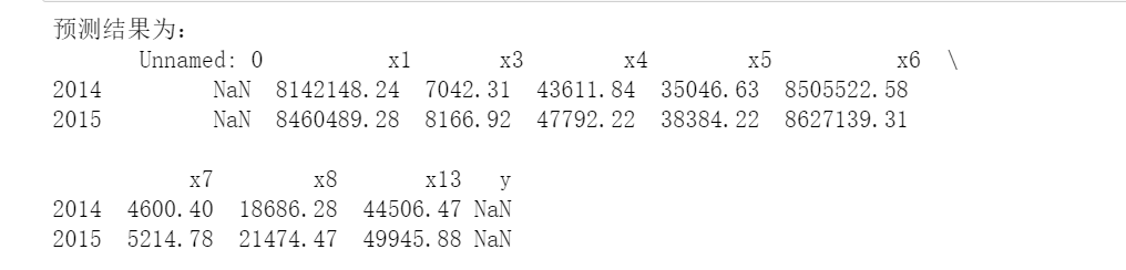 print('预测结果为:\n', new_reg_data.loc[2014:2015,:]) # 预测展示