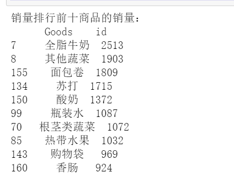 print('销量排行前十商品的销量:\n',sorted[:10])